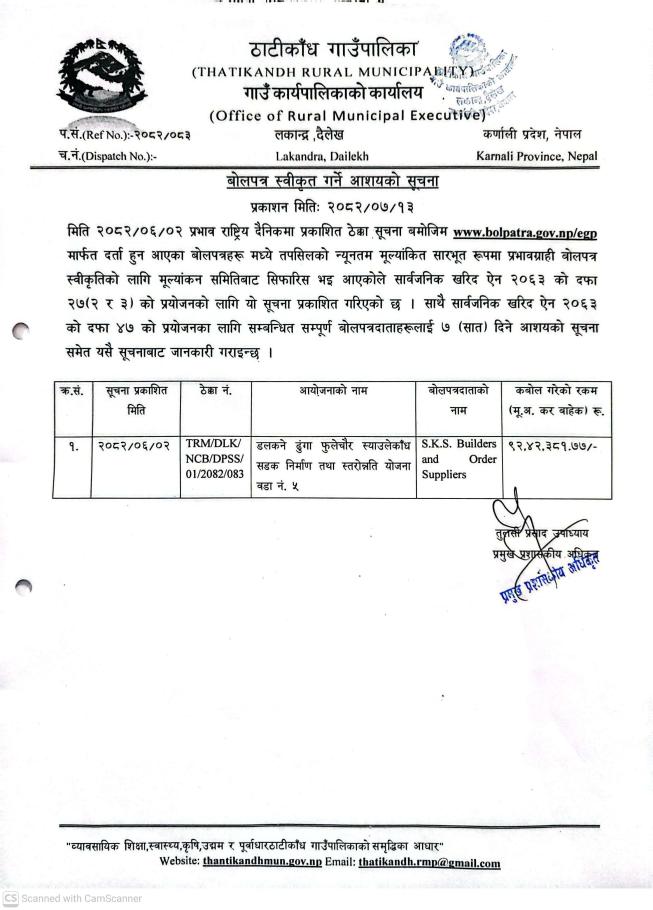 वाेलपत्र स्वीकृत गर्ने आशयकाे सूचना।।